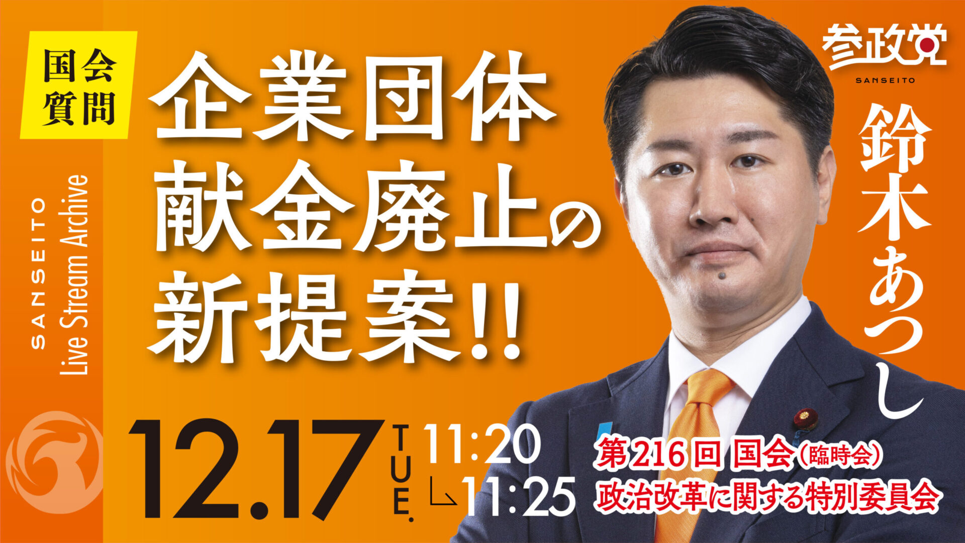 鈴木あつし【国会 12/17】 企業団体献金廃止の新提案!