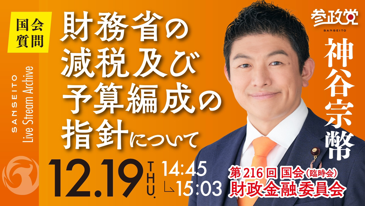 神谷宗幣【国会 12/19】 財務省の減税及び予算編成の指針について