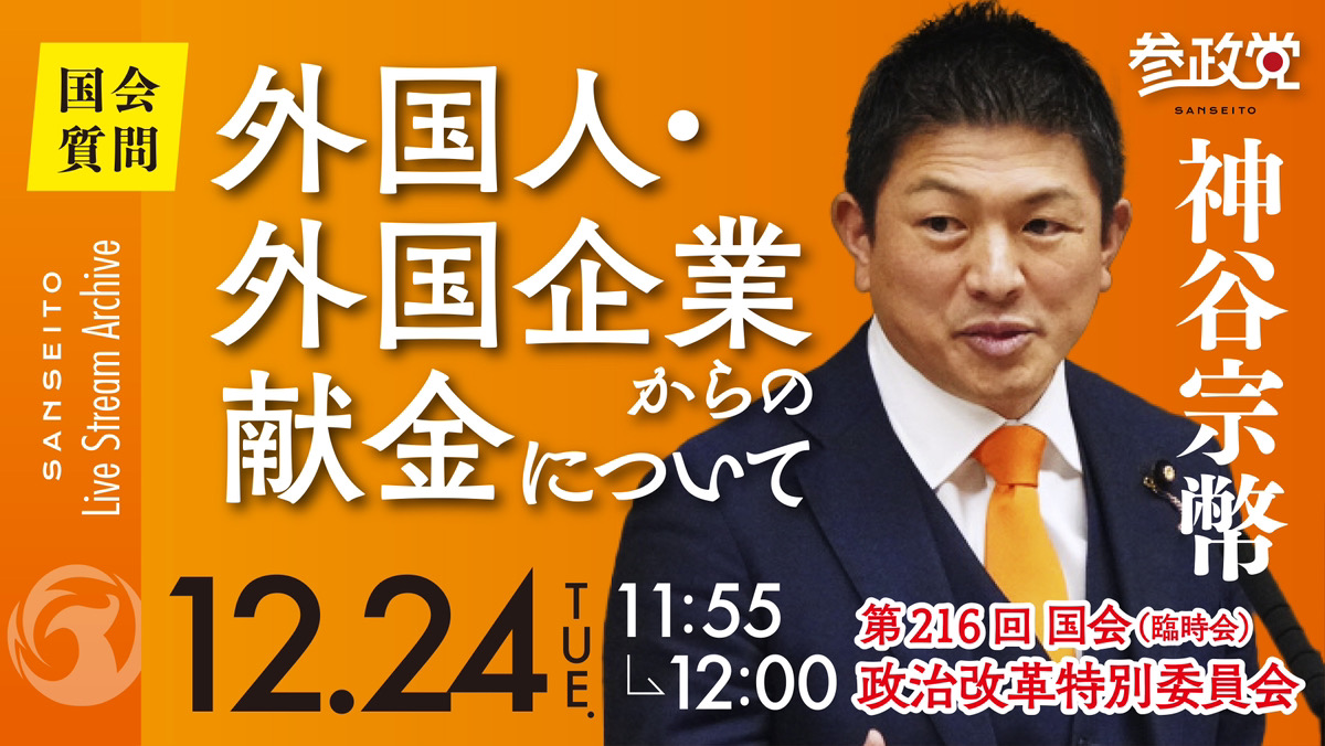 神谷宗幣【国会12/24】外国人・外国企業からの献金について